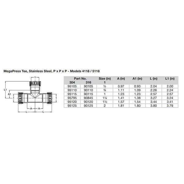 MegaPress 1/2" Stainless Steel 304 Tee - Triple Press Connection - Smart Connect Technology