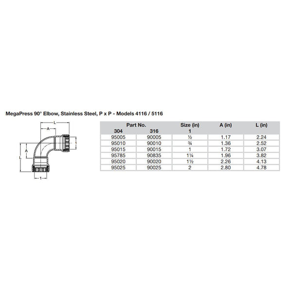 MegaPress 1" 90° Stainless 304 Elbow - Double Press Connection - Smart Connect Technology